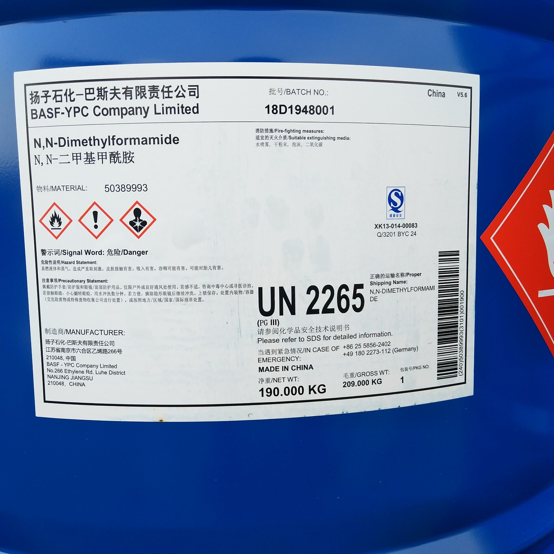 產品名 | N,N-二甲基甲酰胺 | 英文名 | N,N-Dimethylformamide(DMF) | 產品外觀 | 無色透明液體 | 包裝規(guī)格 | 190kg/桶(鐵桶) | 產地 | 江蘇南京 | 供應商 | 揚子巴斯夫 | 應用 | 用作分析試劑和乙烯樹脂、乙炔的溶劑等 | 危險類別 | 3類危化品 | CAS NO | 68-12-2 |